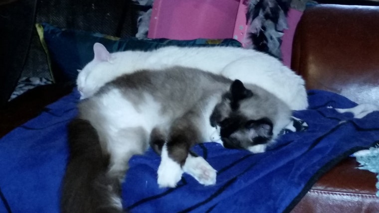 My sweet cats. Coco is the colorful one and she is ragdoll. Princess is my rescue fat cat all in white. -