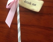 Mason jars with Handmade Alice in Wonderland "Drink Me" tags attached to straws with pink Satin ribbon -