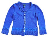 4 out of 5 starsThe sweater is beautiful but it’s navy blue, not the bright blue color in the pictures. If you must filter the color, perhaps to show greater detail, please provide a written description. The filter also distorts the buttons which are not pearlized but bright silver. Other than that, the sweater is perfect , a barely worn high quality Pure brand.