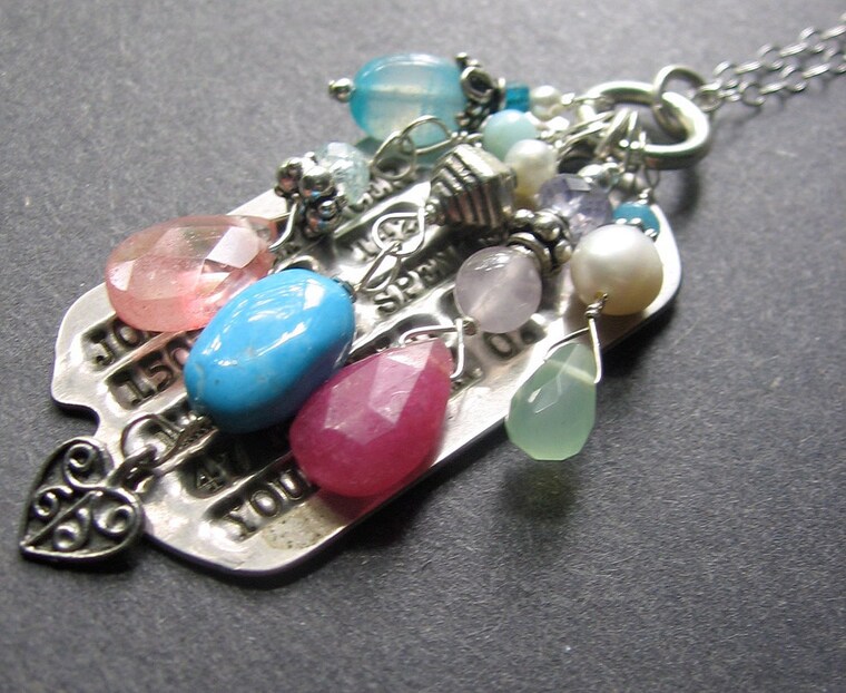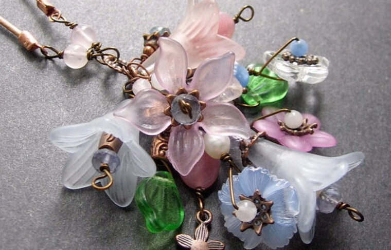 Inspired by the garden outside my workroom. It features vintage lucite flower beads and gemstones.