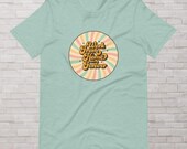 5 out of 5 starsFan of the Work From Home Forever podcast and liked the look of the shirt. Ordered on the 8th and arrived in the mail on the 18th which is the delivery estimate I got on my confirmation. The shirt is nice and soft, not like those stiff, hard, scratchy Gildan brand shirts a lot of these sellers offer. This graphic is pretty nice and the colors pop on the shirt. Even though the graphic is large, it's not stiff like iron on shirts or the shirts that were made with a Cricut. We will see how the graphic holds up after a few washes. I am 5'10 and 245 lbs and got the XXL. I wore it the first time today and it's a little big. It says pre-shrunk, so we'll see if it fits better after a wash or two. I ordered the Dusty Blue color and I like it. It's got a retro look to it and looks happy and bright. Perfect for when I work from home!