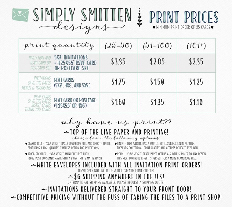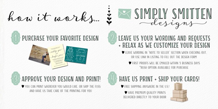 In order to complete your order, it's necessary to furnish specific information (which you've authorized Etsy to share with me), including your name, email address, mailing address, payment details, and specifics about the product you intend to purchase. Optionally, you may decide to share extra personal details (such as for a personalized invitation order) by reaching out to me directly.