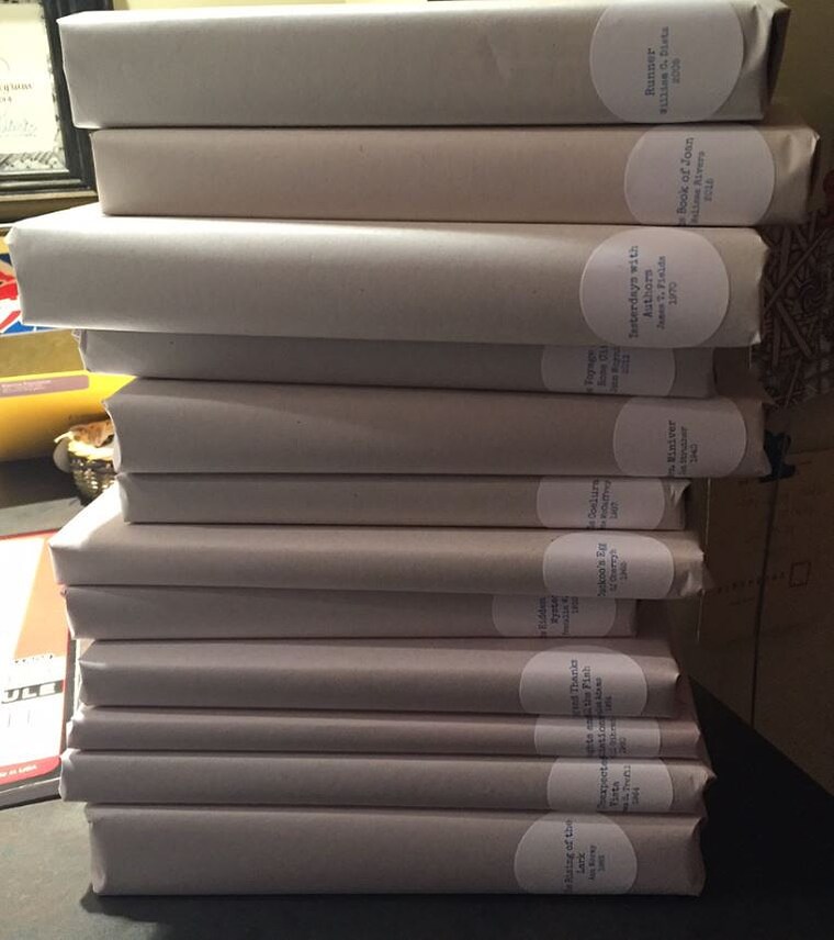 Packing up Books as Canvas for my first edition Found Poetry Kits! -