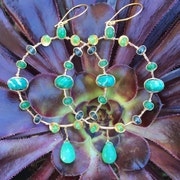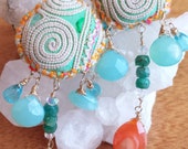 My jewelry is a collage of many things: 14K to 18K gold chain, 14K gold filled wire (i have an affinity for yellow gold, reminding me of eastern jewelry), sterling silver wire and chain, seashells wrapped in emeralds, sapphires, rubies, tourmaline, iolite, opal, amazonite, quartz, druzy, large crystals, turquoise, labradorite, moonstone, sleeping beauty turquoise, and tons of chalcedony! In addition there are naturally shed feathers from a bird sanctuary, seashells from the shores of beaches from all over the world, and small Hmong pillow pockets from Laos.