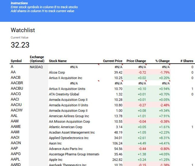 Watchlist_NASDAQ ( Stocks ): Track Stock tickers; enter shares in H for live price, change, value. -