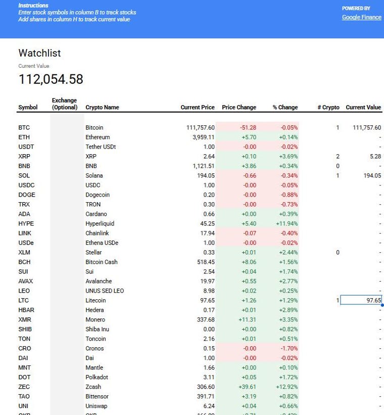 Watchlist_CRYPTO: Add coins in B, quantity in H — price, 24h change and value auto-fill. -