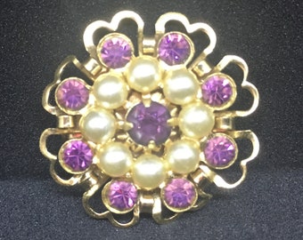 Amethyst and Pearl Rhinestone Pin with Heart Detail Vintage Costume Brooch