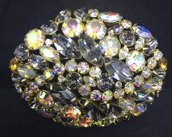 Alice Caviness: Large, Elegant, Rhinestone Brooch in Smokey and Light Golden Aurora Borealis