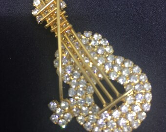 Rhinestone Guitar or Viola with Bow Vintage Brooch