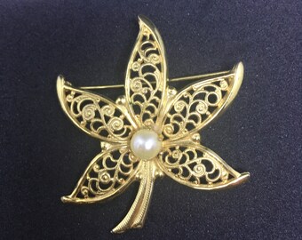 Gold Filigree Leaf with Pearl Vintage Costume Brooch
