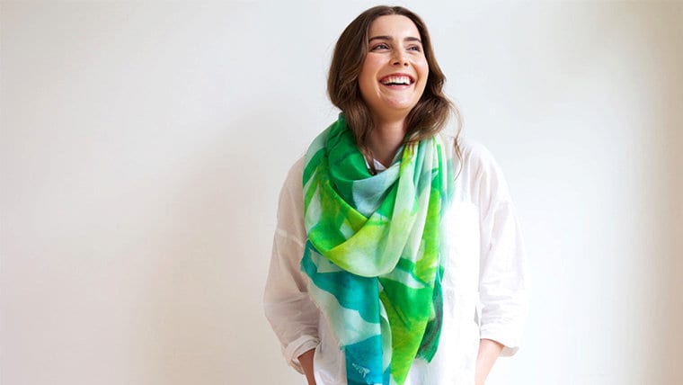 Our 100% cashmere Lisianthus scarf in bright greens, teals and acid yellows. -