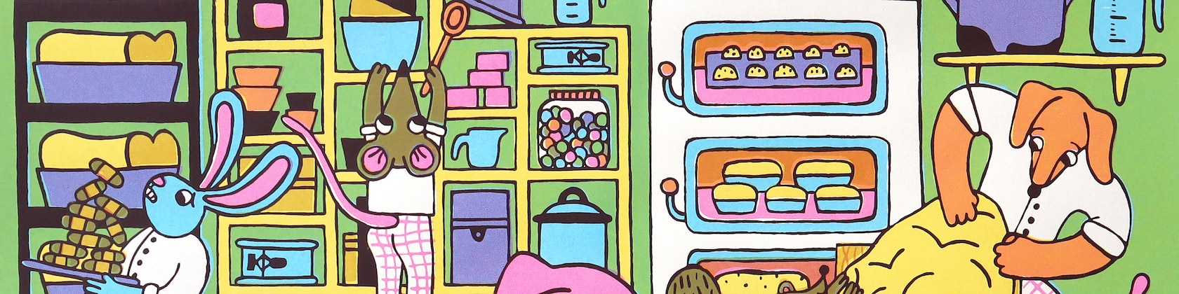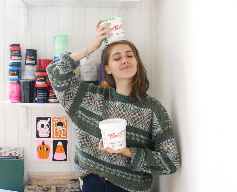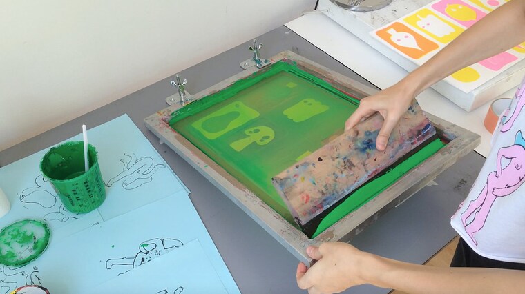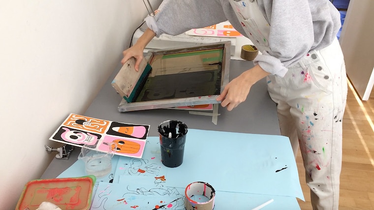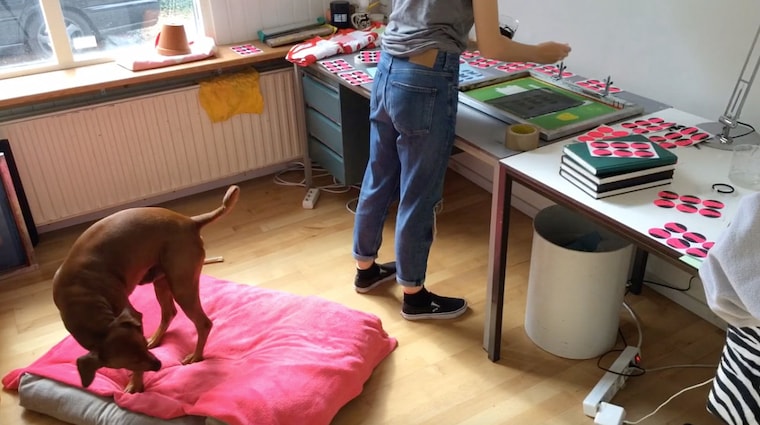 Screen printing with studio dog Willem. -