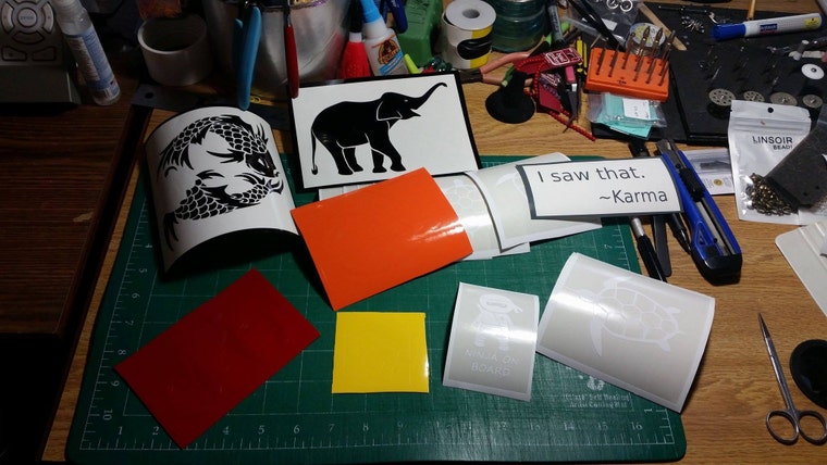 Cut, weed and tape the decals for our orders today. -