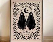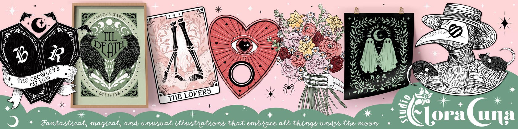 Each design you see here is original, with inspiration from botanical elements, historical references, and magical motifs. I love to work surrounded by my plant collection, my dogs (Harold and Skippy), and a comedic true crime podcast in my ears. Period movies and television have been a focal point in my life since childhood, which greatly inspires my vintage-themed designs. My desire to celebrate a gore-free Halloween year-round inspires my other designs that are cute, spooky, and never scary.