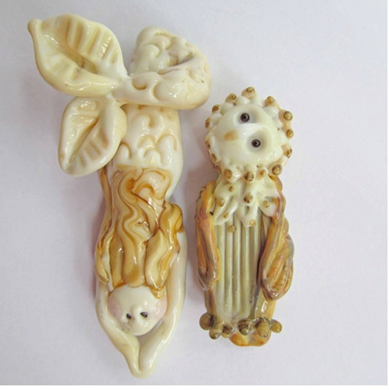From a class I taught for Bead & Button in 2014. It was about working with neutral colors in glass. Both are foca beads
