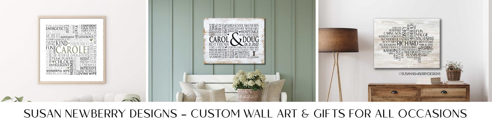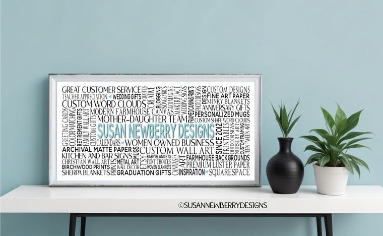 Welcome to Susan Newberry Designs, where we create beautiful artwork for your home. Our specialties include custom word clouds and wedding - anniversary prints and canvases. Just sent us the text and let us do the rest! If you don't see what you want, just ask. We love doing custom orders. Susan Newberry Designs is pleased to be among Etsy's top sellers.