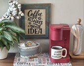 5 out of 5 starsLove this coffee mat! It’s a very nice addition to my coffee area. Contrasting fonts make it really pop!