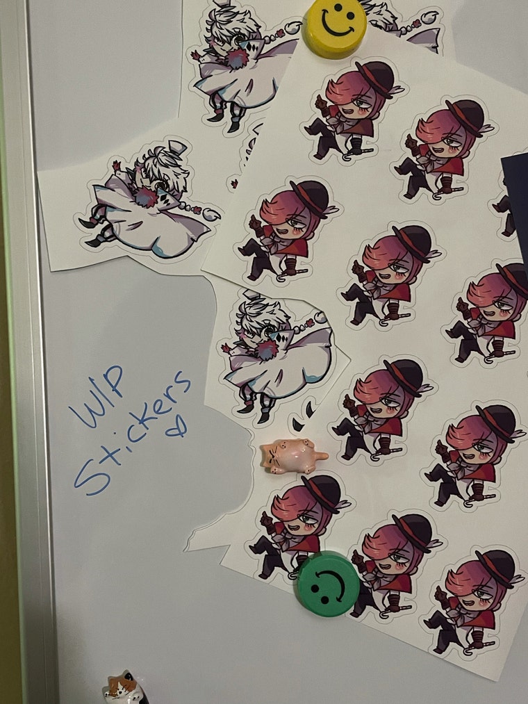 STICKERS! I also hang my WIP stickers on my white board! All of my stickers are cut by hand -