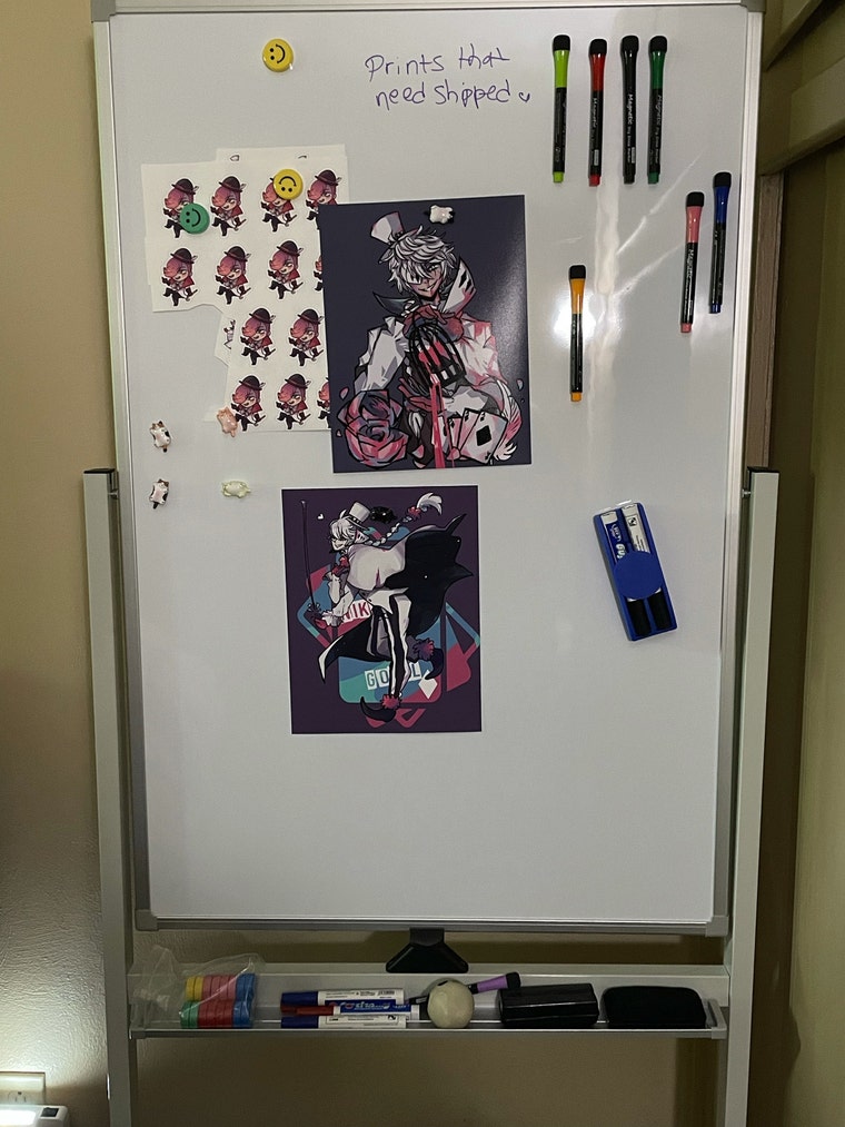 THE PRINT BOARD! prints ready to be shipped get hung onto my dry-erase board to avoid damage and to keep them safe!! ✨🤍