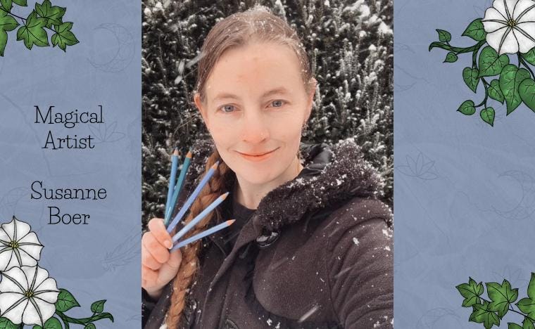 Hi! My name is Susanne. I am a Magical Artist from the Netherlands, inspired by the magic in and around us us. From falling leaves in the forest to the dancing flame of a candle in the living room, the world is full of wonders! You just have to look closely to find it in everyday life. In my work, I want to make this magic visible and tangible. I would love to guide you into a mindset of wonder: a combination of connection with nature, a touch of spirituality, and bringing mythology and stories to life.