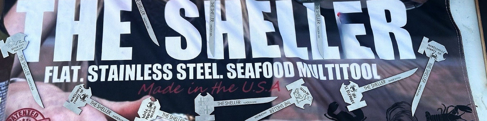 “THE SHELLER: Patented, flat, stainless steel multi-function, mallet, knife and bottle opener; MADE IN THE USA. Developed by Songwriter, Singer and Entrepreneur Shelby Blondell.”