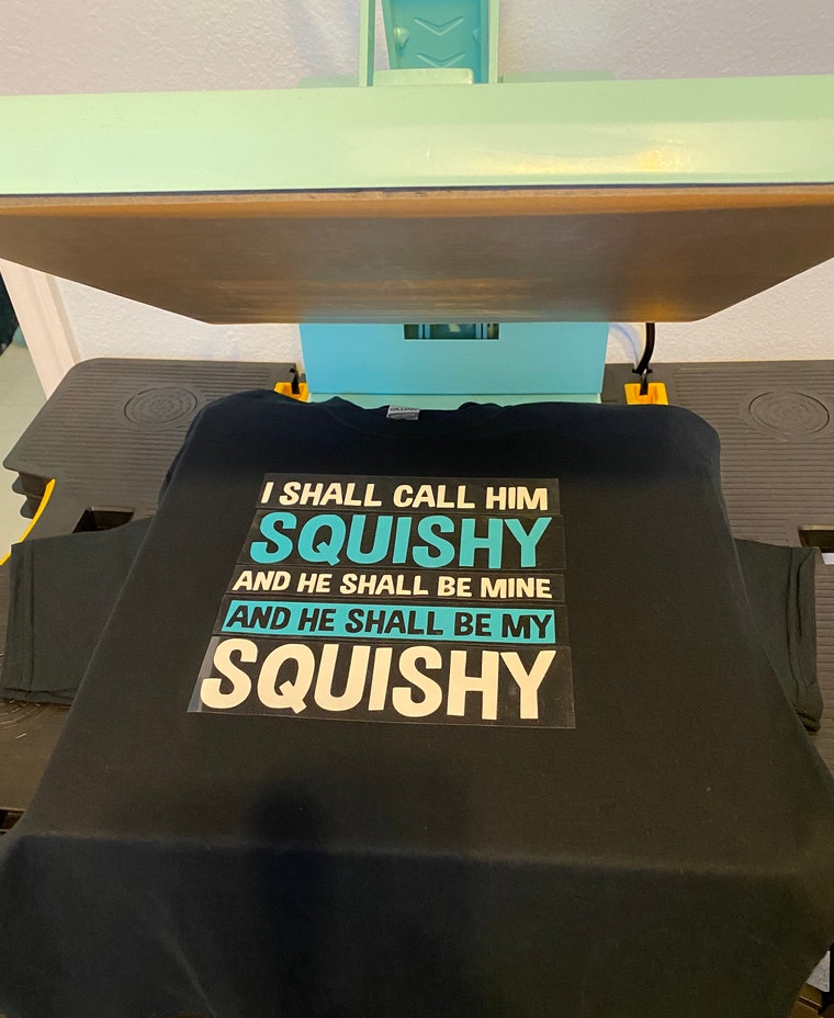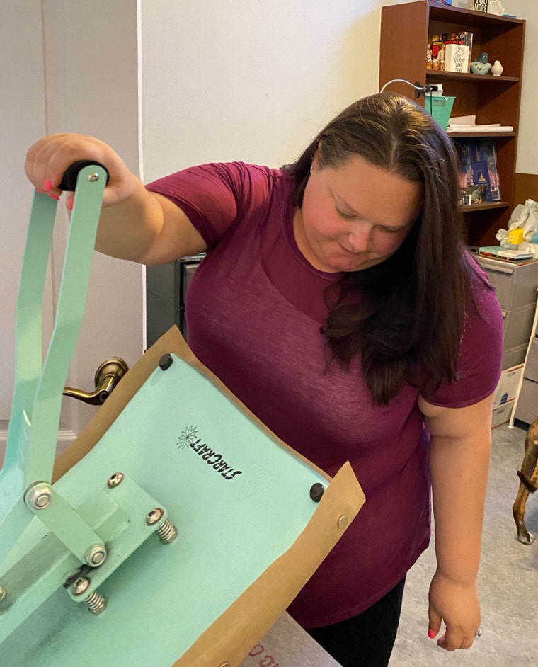 After the design is cut, I weed off the extra vinyl and press the image using my heat press.