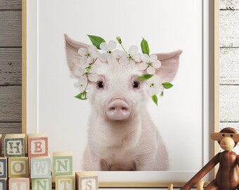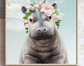Baby hippo with flower crown, DIGITAL DOWNLOAD, Girls room decor, Boho nursery, Baby animal prints, Animals with flowers, Nursery wall art