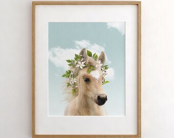 Baby horse with flower crown and blue sky, PRINTABLE ART, Girls room decor, Boho nursery animal prints, Animals with flowers, Nursery art