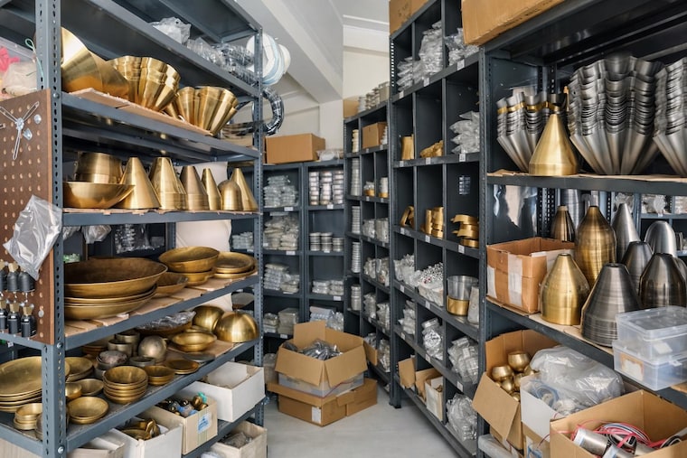These shelves hold the heart of our craft heavy raw brass pieces that will soon become handcrafted lights.