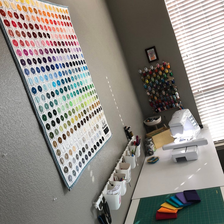 ¡Soy yo! Me gusta hacer creaciones de telas funcionales en mi estudio en casa.