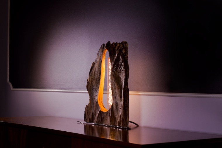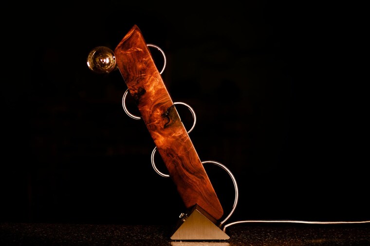 Phoenix Rising lamp highlighting the natural rolling curves of a piece of spalted wood surrounding an antique bulb.
