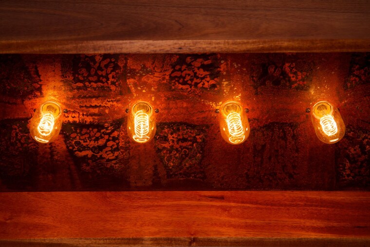 Brown patina steel and mahogany lightbox chandelier featuring a recessed solid steel plate housing four filament bulbs. -
