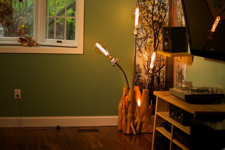 Nature inspired floor lamp rises over 5 ft. tall and features flower like hand forged steel bulb stems and a tree stump. -