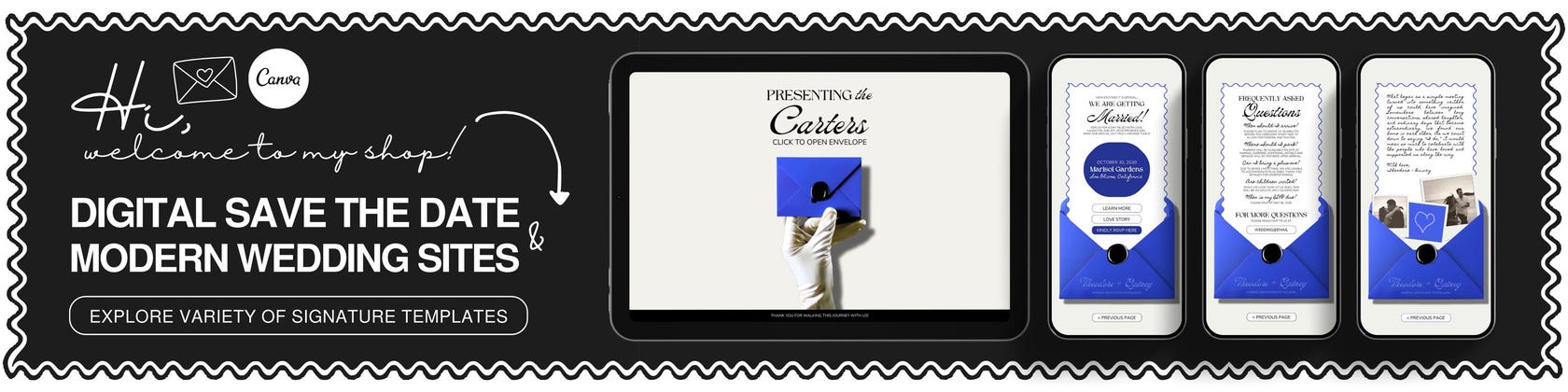Ciao, sono Alex, il designer di questo negozio. Creo siti web per matrimoni moderni e facili da modificare e modelli "save the date" per aiutare le coppie a condividere il loro giorno più bello e senza stress.