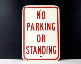 Vintage Metal "No Parking or Standing" Sign in Red and White, 18" tall (c.1970s) - Industrial Home or Urban Loft Decor, Man Cave