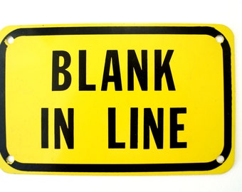 Vintage Industrial Metal "Blank In Line" Sign, Black on Yellow, 8" long (c.1980s) - Industrial Decor, Altered Art Assemblage