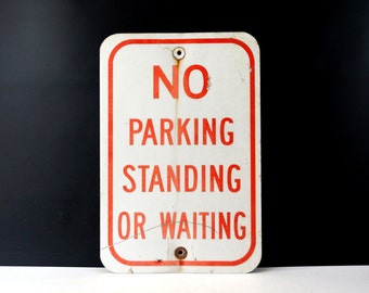 Vintage Metal "No Parking Standing or Waiting" Sign in Red and White, 18" tall (c.1970s) - Industrial Home or Urban Loft Decor, Man Cave