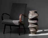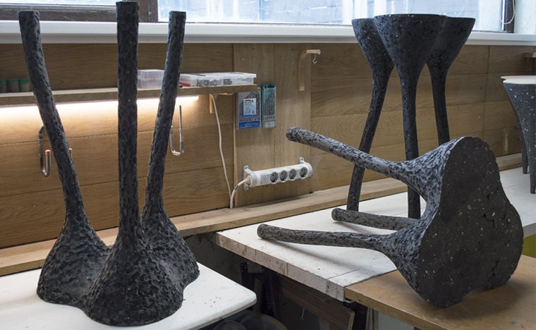 I work with a unique concrete-like material made primarily from recycled paper. Strong like wood, visually similar to concrete, and slightly elastic, it allows for durable yet expressive forms. Each piece is handmade, one of a kind, and carries natural variations that make it unique.