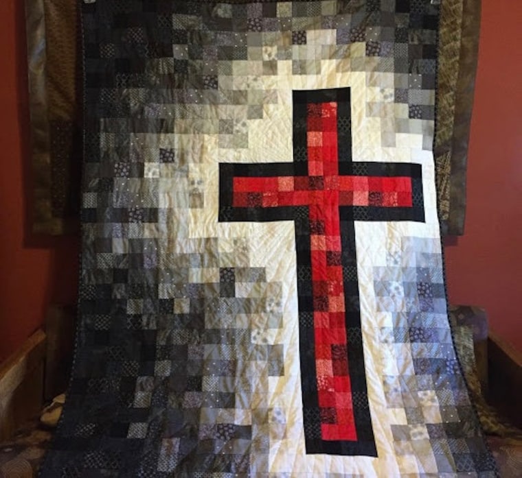 Pieced together squares in different blacks, grays and whites, with the red cross.