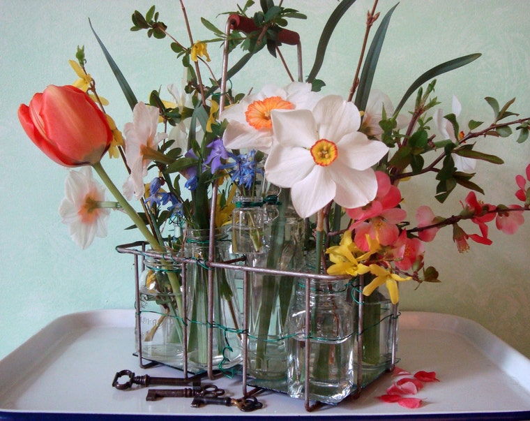 This useful carrier once held two 1-quart milk bottles. With little glass jars and backyard flowers ... a centerpiece.