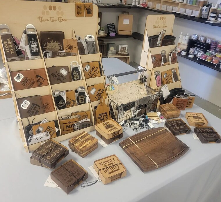 We started Three Two Three back in 2017. I had a hard time finding a decent job after moving to Tennessee from Michigan with my husband who is active-duty Army. I started with cornhole, giant Jenga, and yard dice. I found I really loved to get creative with it and then just kept expanding to whatever I could teach myself to do. After the cost of wood skyrocketed after covid, I turned to smaller items and ended up buying a CNC in the fall of 2020 and a laser in the spring of 2022.