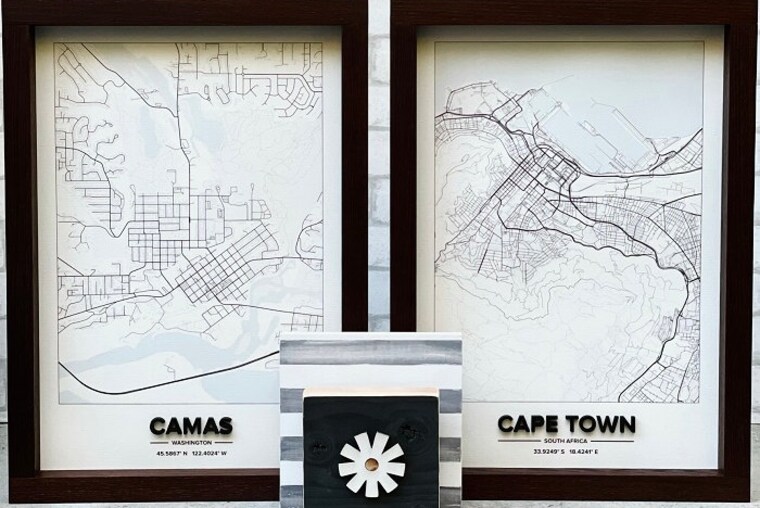 Collaboration between map savvy husband and artist wife to create custom maps with 3D lettering, GPS coordinates. -