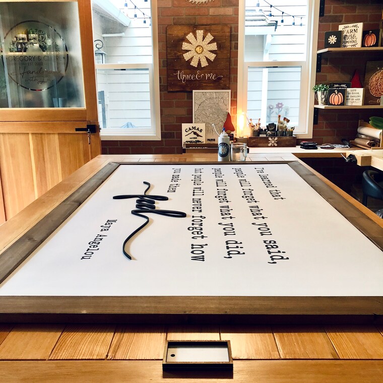 Our workspace. The 56x32 inch hand painted sign with 3d elements was a custom project. -