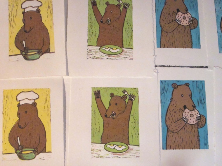 Bears! Hot off the press. Three bears cooking and eating. Multi-block linocuts. -
