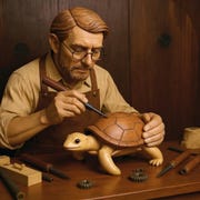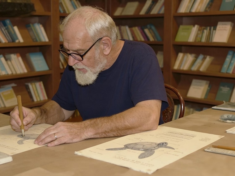 A designer hand-drawing the blueprint for a sea turtle model. -