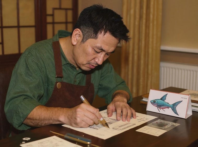 A designer hand-sketching the blueprint for a deep-sea fish model. -