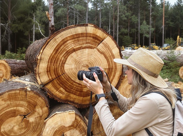 A photographer captures the grain details of black walnut wood, freshly harvested in the forest. -