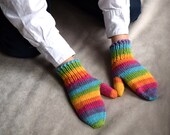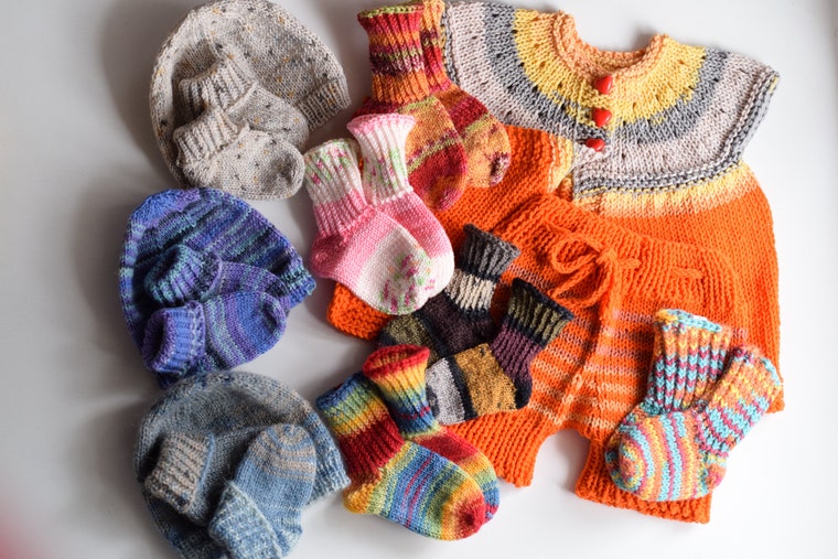 Since I use precolored wool for my baby socks and hats, the stripes will be laid out differently for each item. It is a property of the yarns I use. Stripes will be wider on small newborn items and narrower on bigger sizes.
