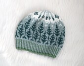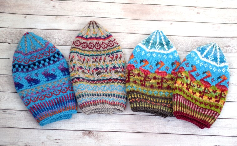 Winter hats knit from thin wool yarn. The colorwork is knit by hand, each hat slightly different and unique. -