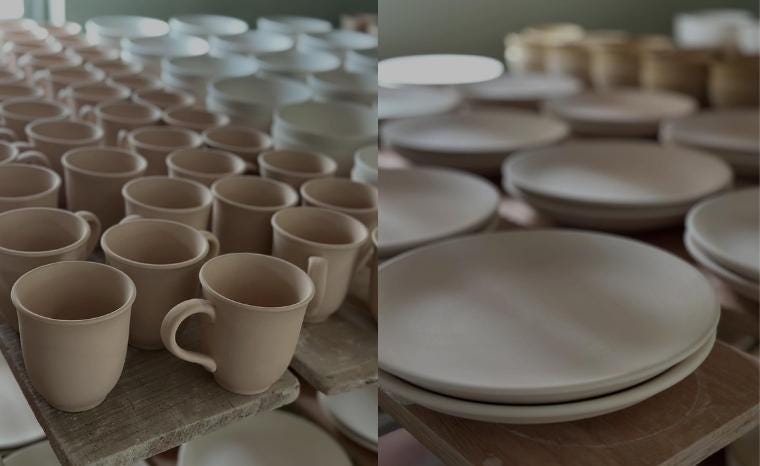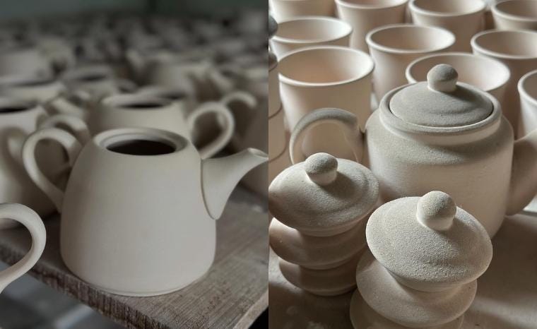 Pouring pieces in progress—spouted forms refined by hand for smooth whisking and clean pours. -
